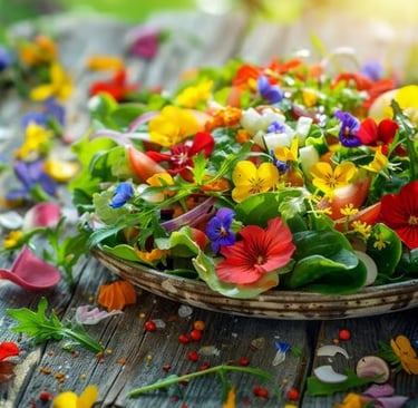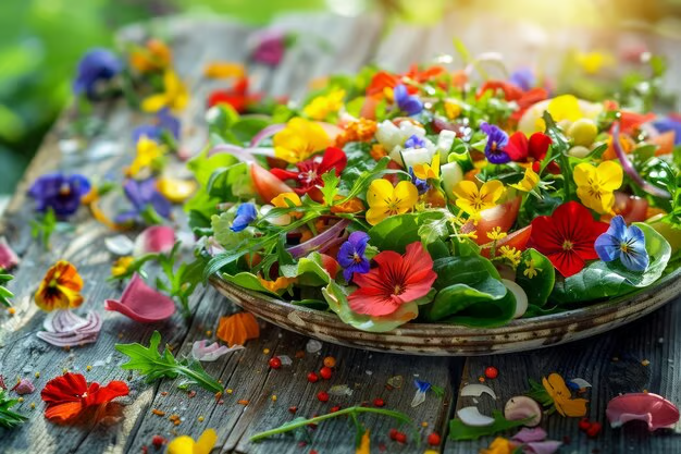1- السلطات: يمكن استخدام الزهور مثل نبات الكبوسين والبنفسج لإضافة اللون والنكهة إلى السلطات.